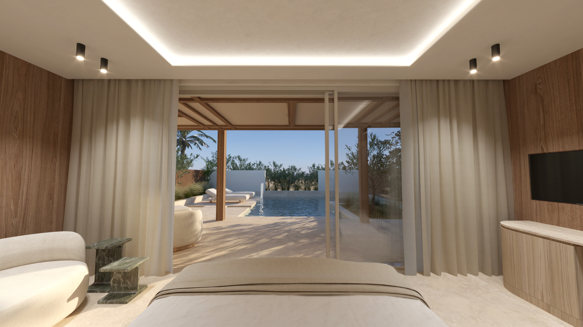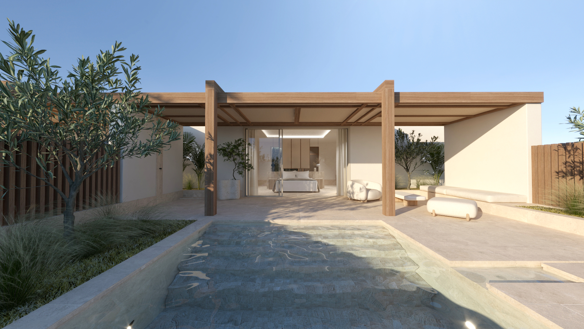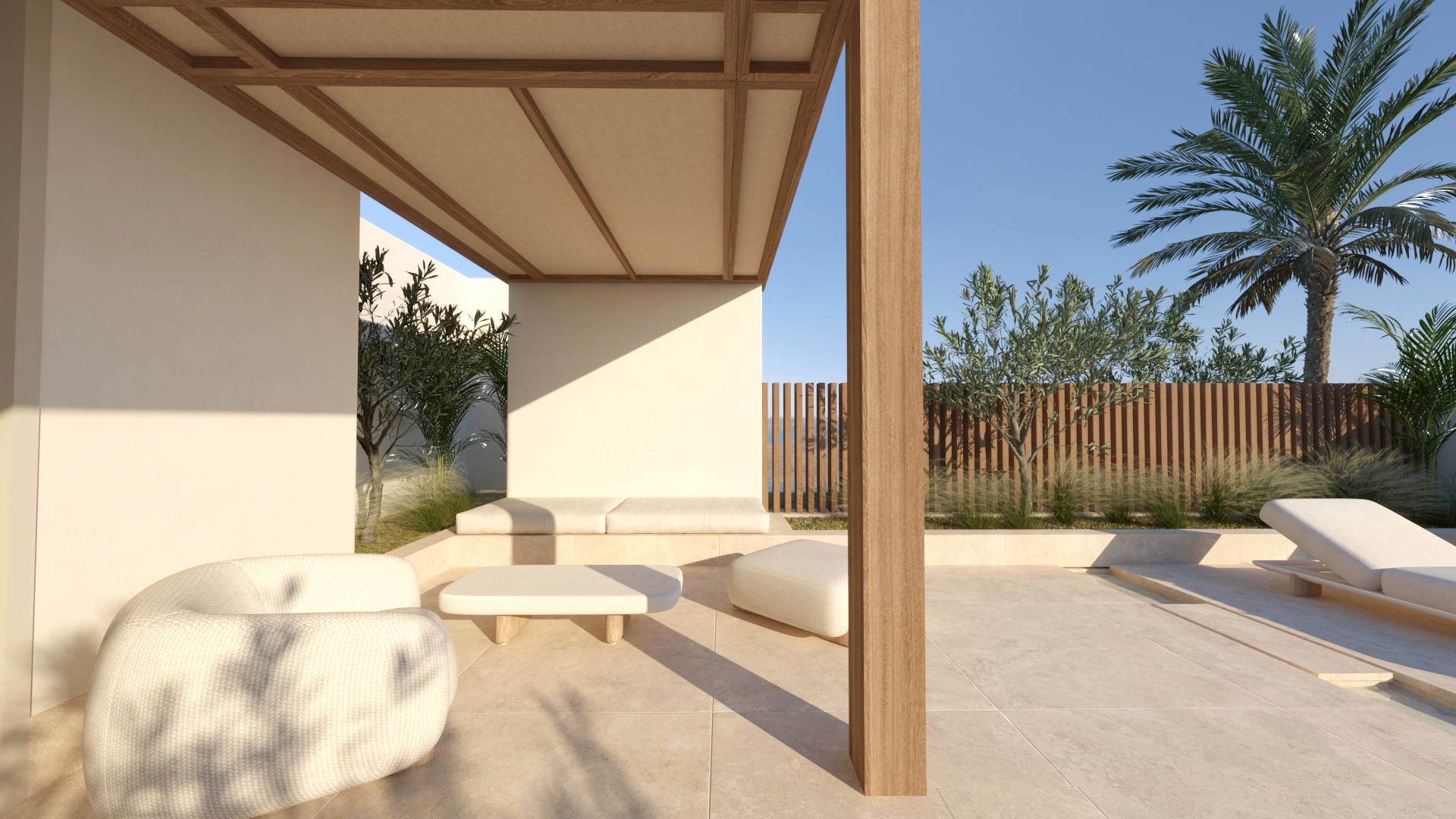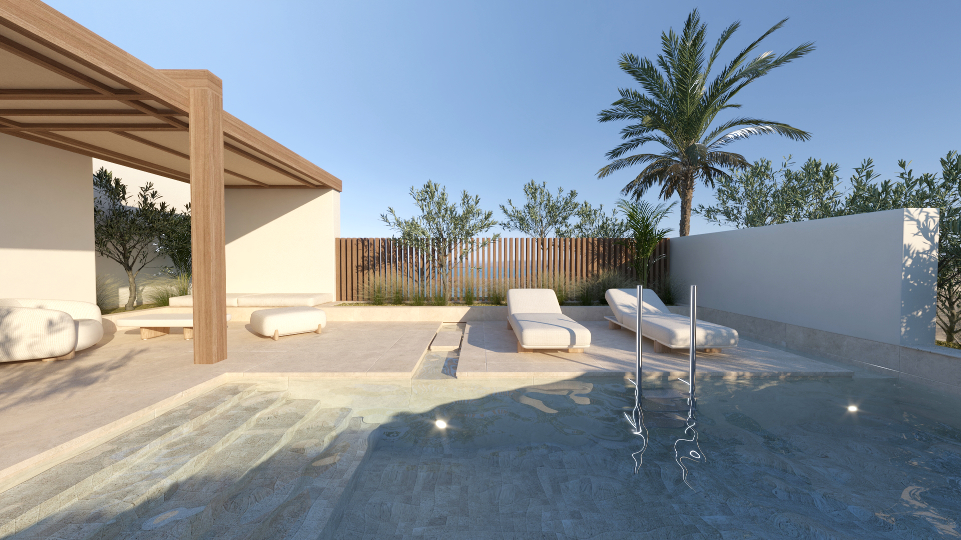 Ο εξωτερικός χώρος μεταφράζει αυτή την αισθητική σε αρχιτεκτονικές κατασκευές όπως πέργκολες σε αυστηρές γραμμές από επεξεργασμένη ξυλεία, λιτά διαχωριστικά και διαλεκτά έπιπλα με λεπτομερή σχεδίαση, με τη συνολική εικόνα να αποπνέει φινέτσα.
