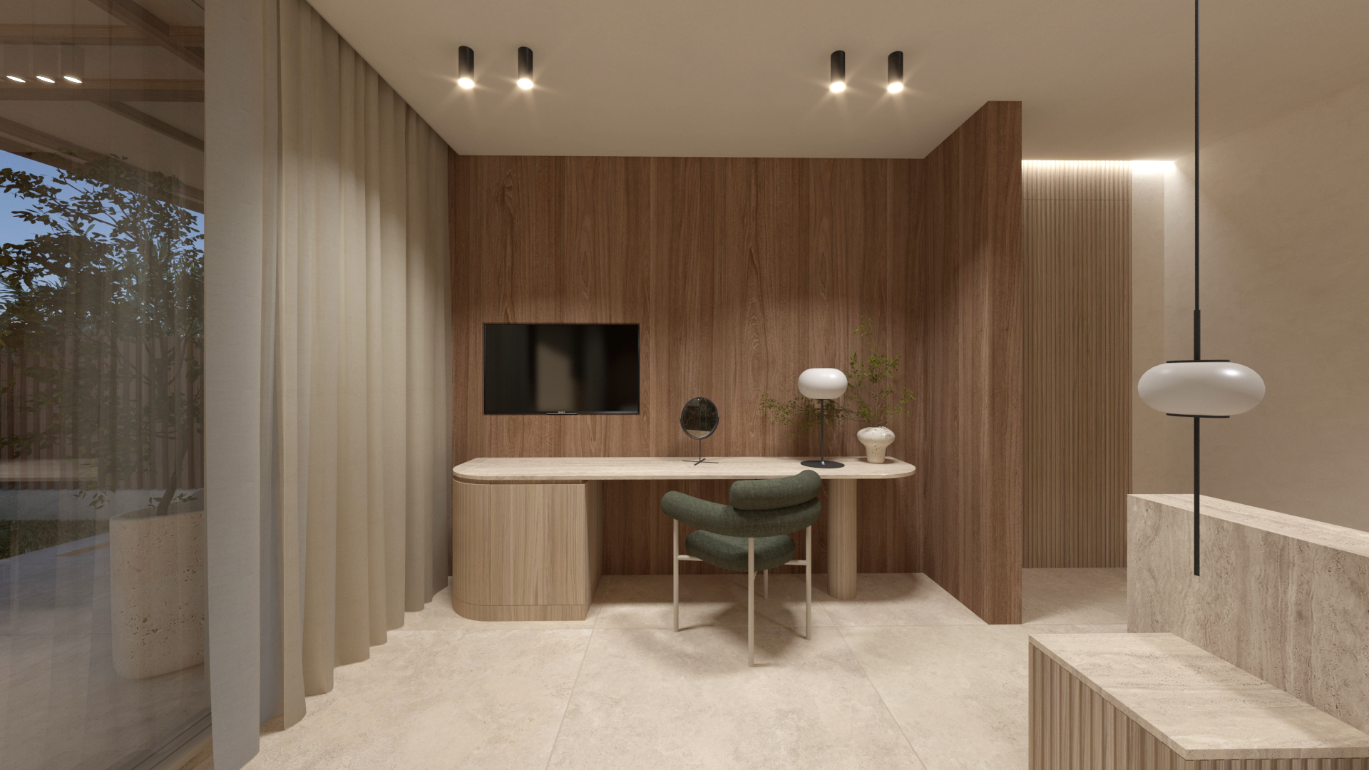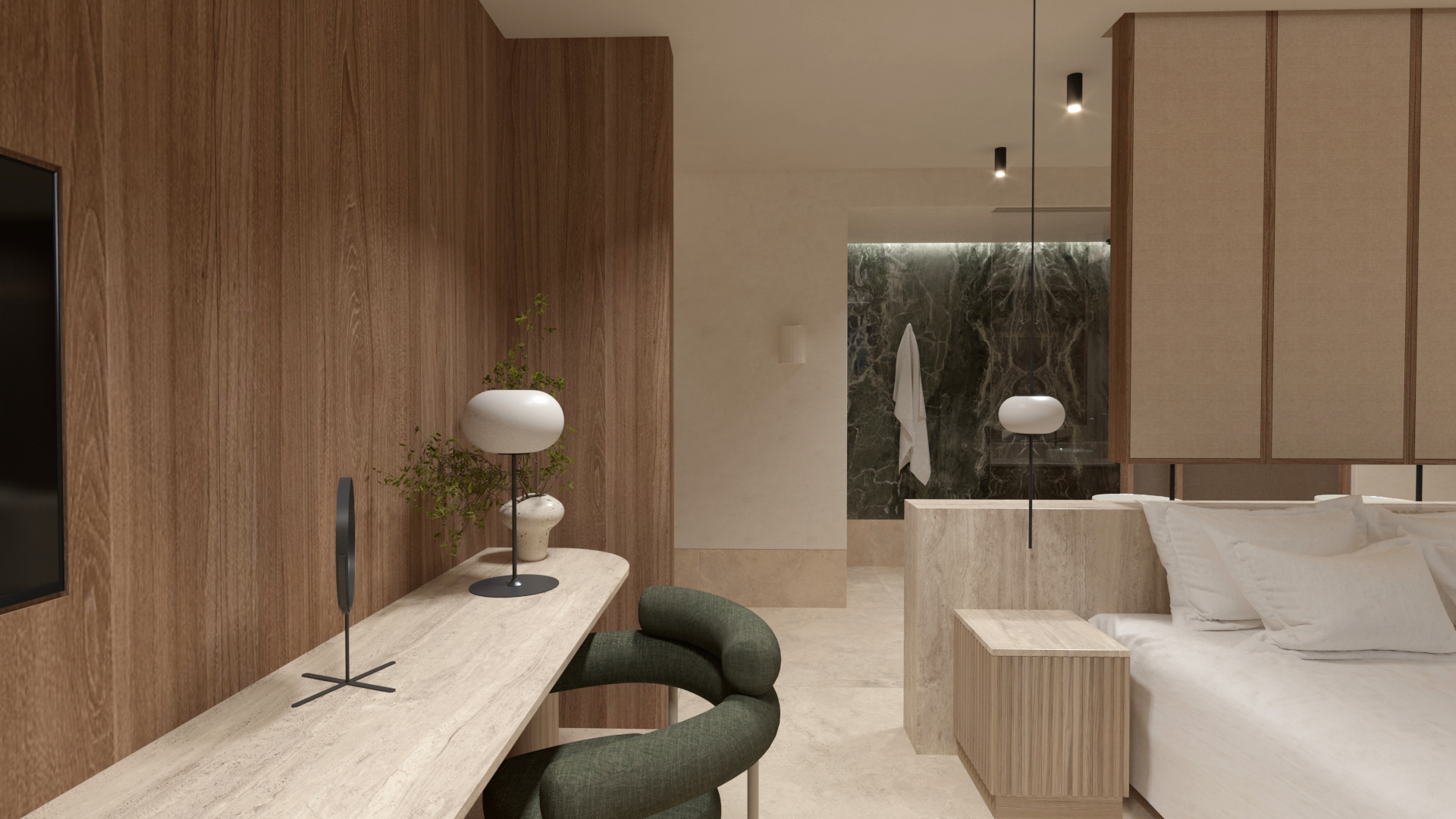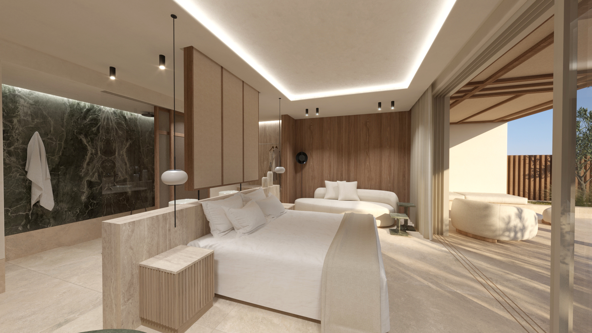 Οι εσωτερικοί χώροι οργανώνονται με καθαρές γραμμές, και αρμονικούς συνδυασμούς ιδιαίτερων υλικών όπως το φυσικό μάρμαρο και η υψηλής ποιότητας ξυλεία. Ο σχεδιασμός είναι γεωμετρικά ήπιος και ο φωτισμός έμμεσος με σκοπό να αναδεικνύει την υφή και την κομψότητα των επιφανειών. Επιπρόσθετα, οι επιλογές των επίπλων και των υφασμάτων τους γίνονται με γνώμονα την εργονομία αλλά και τη σκηνοθετική παρουσία.