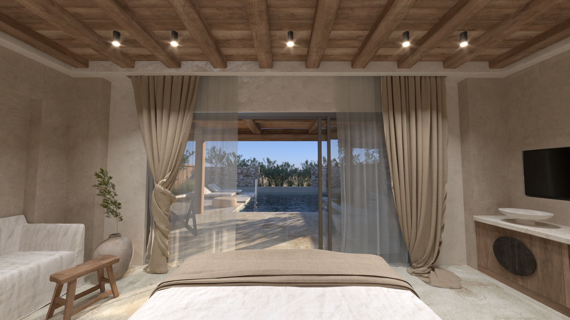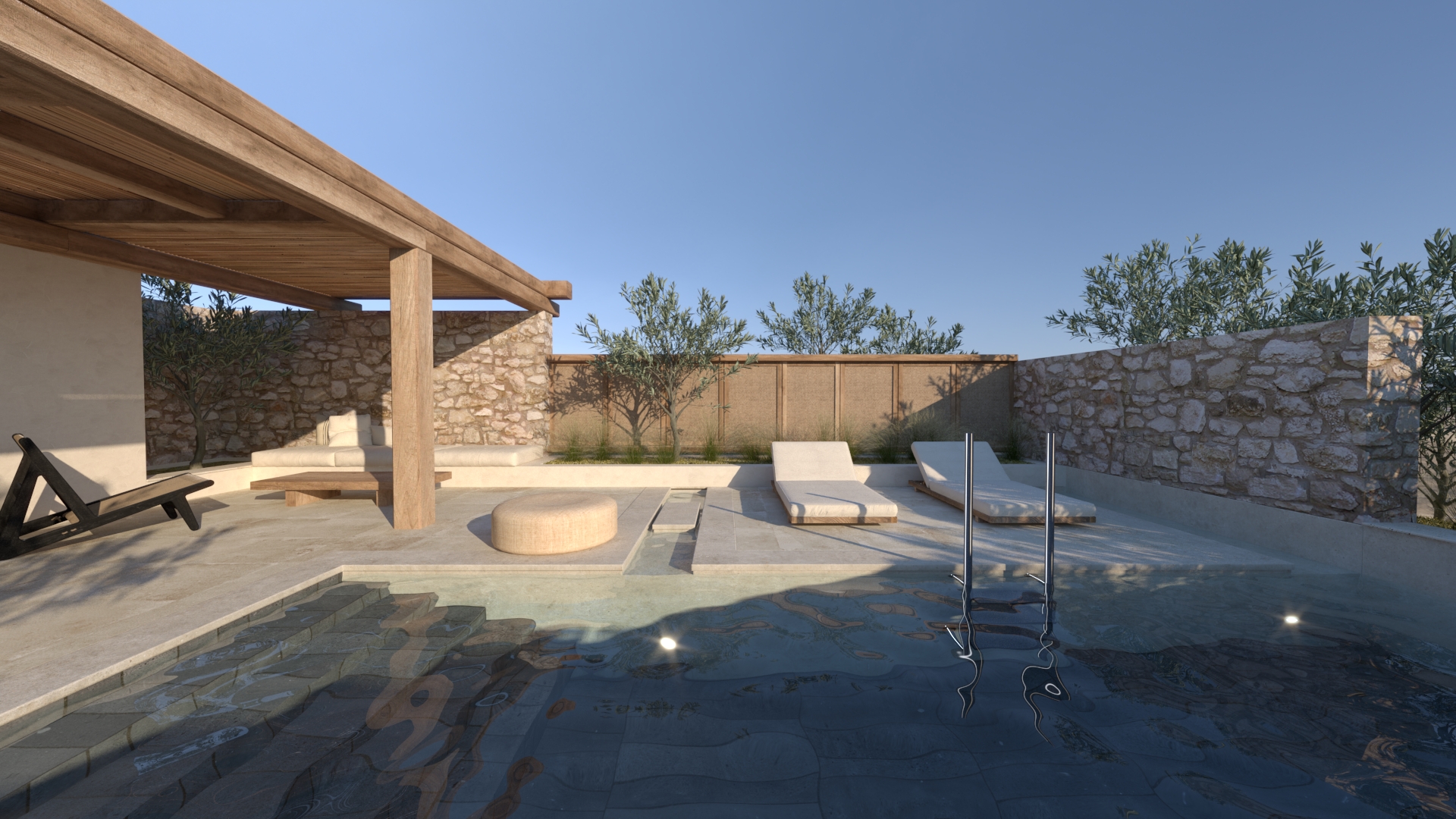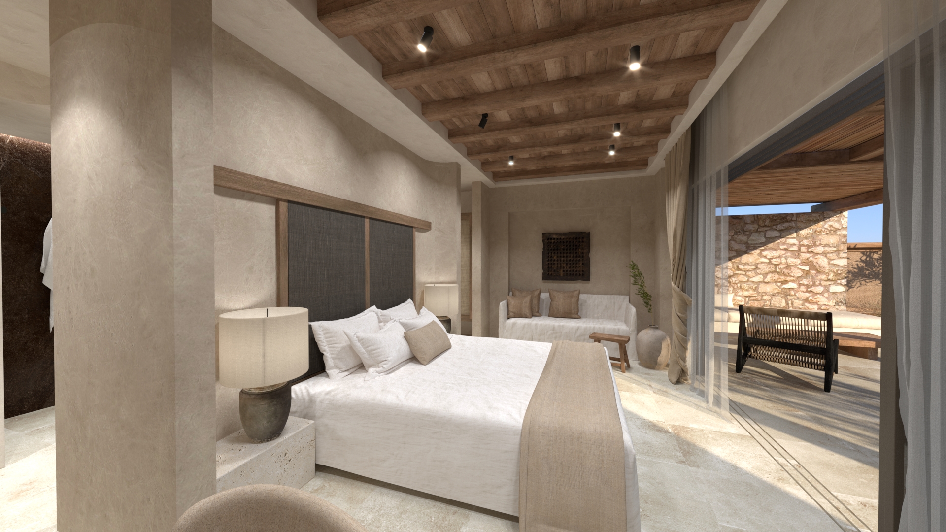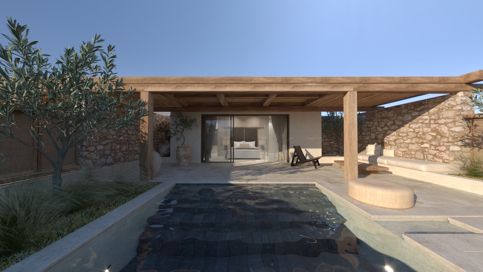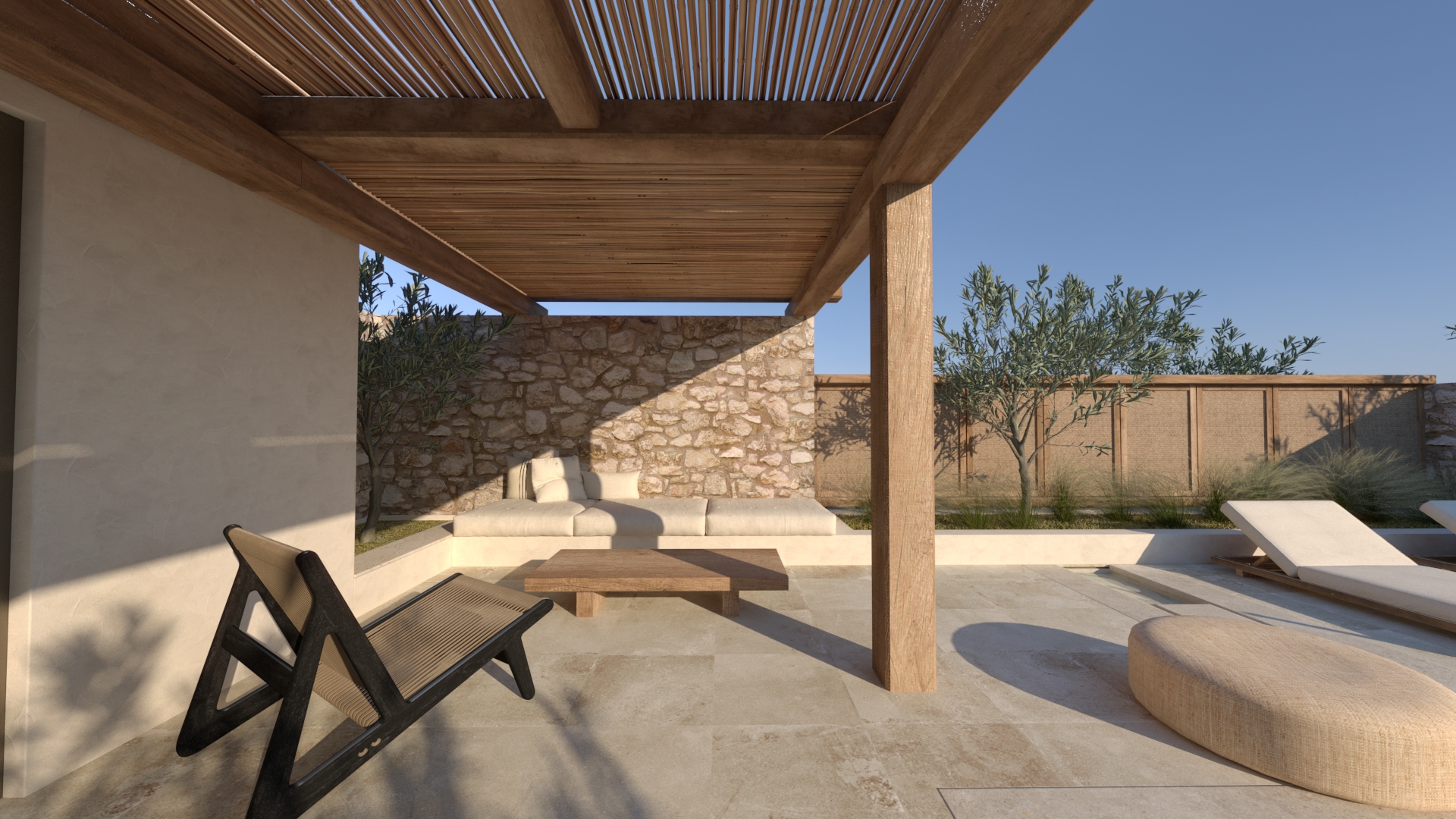 Στο εξωτερικό, οι επιφάνειες ακολουθούν την ίδια φιλοσοφία. Οι πέργκολες είναι μασίφ, χειροποίητες, συχνά με εμφανή τα σημάδια του χρόνου. Πέτρινα δάπεδα, διακοσμητικά και κάθε είδους κατασκευή μοιάζει να έχει «ωριμάσει» μαζί με τον χώρο..