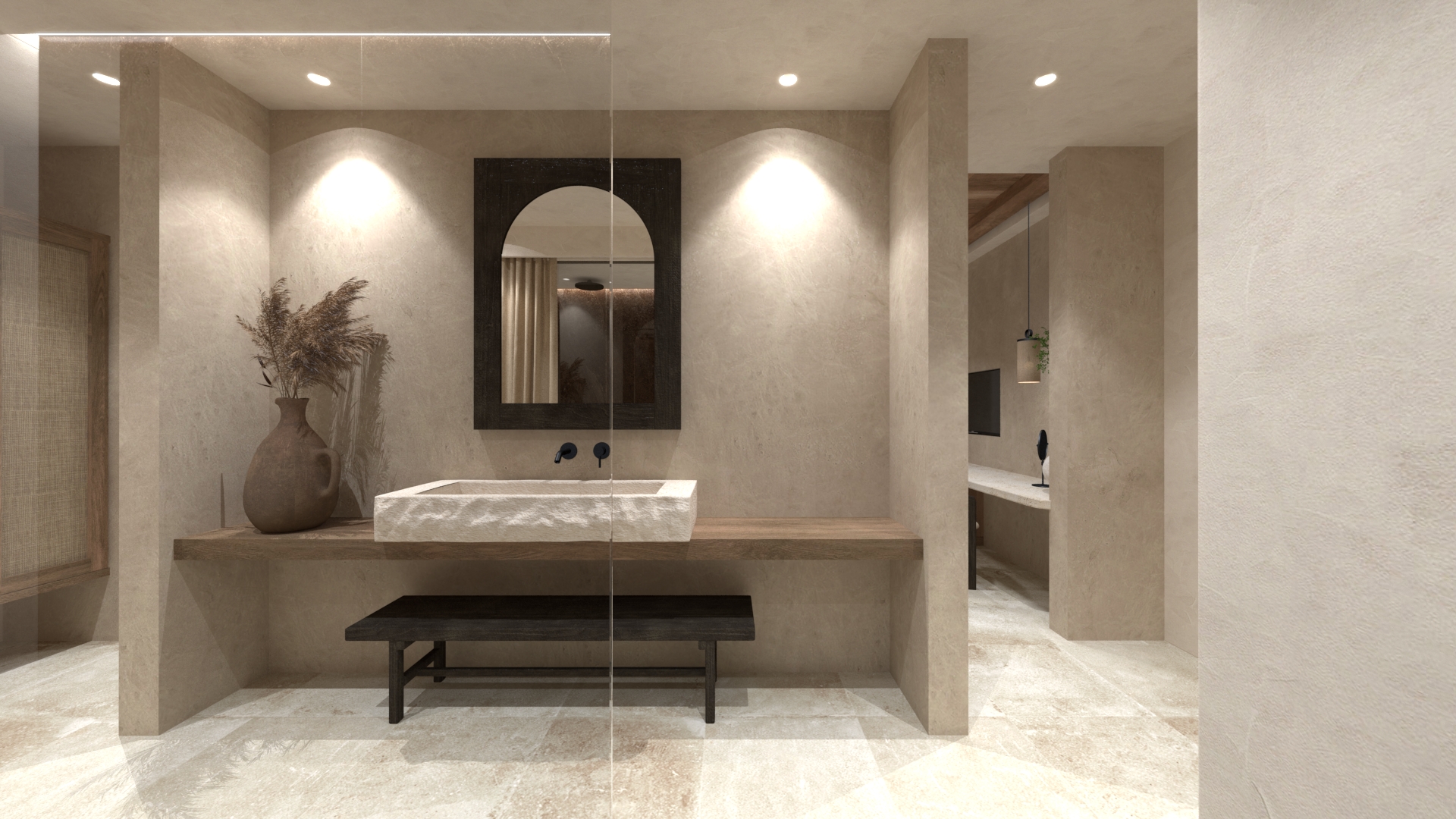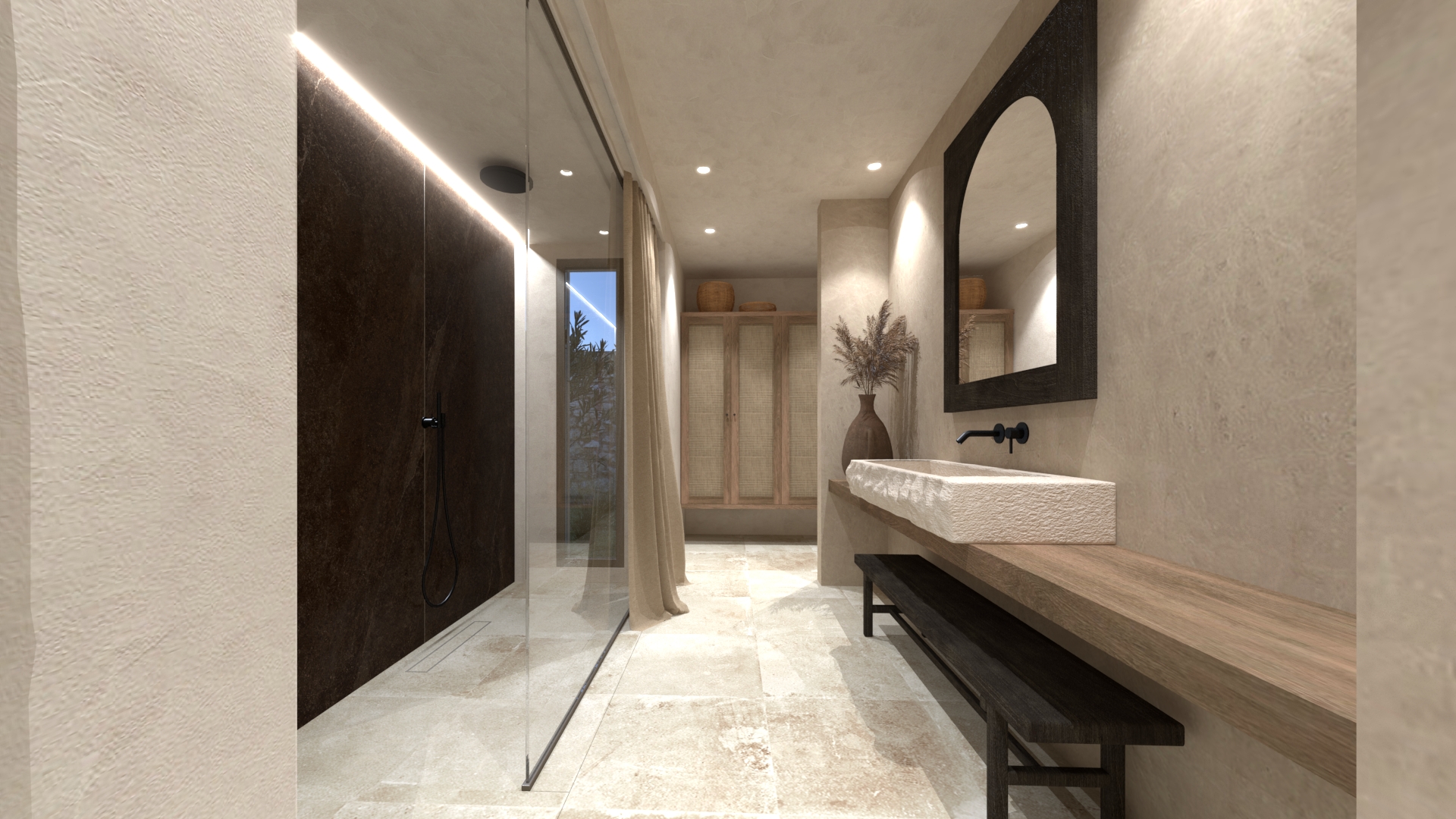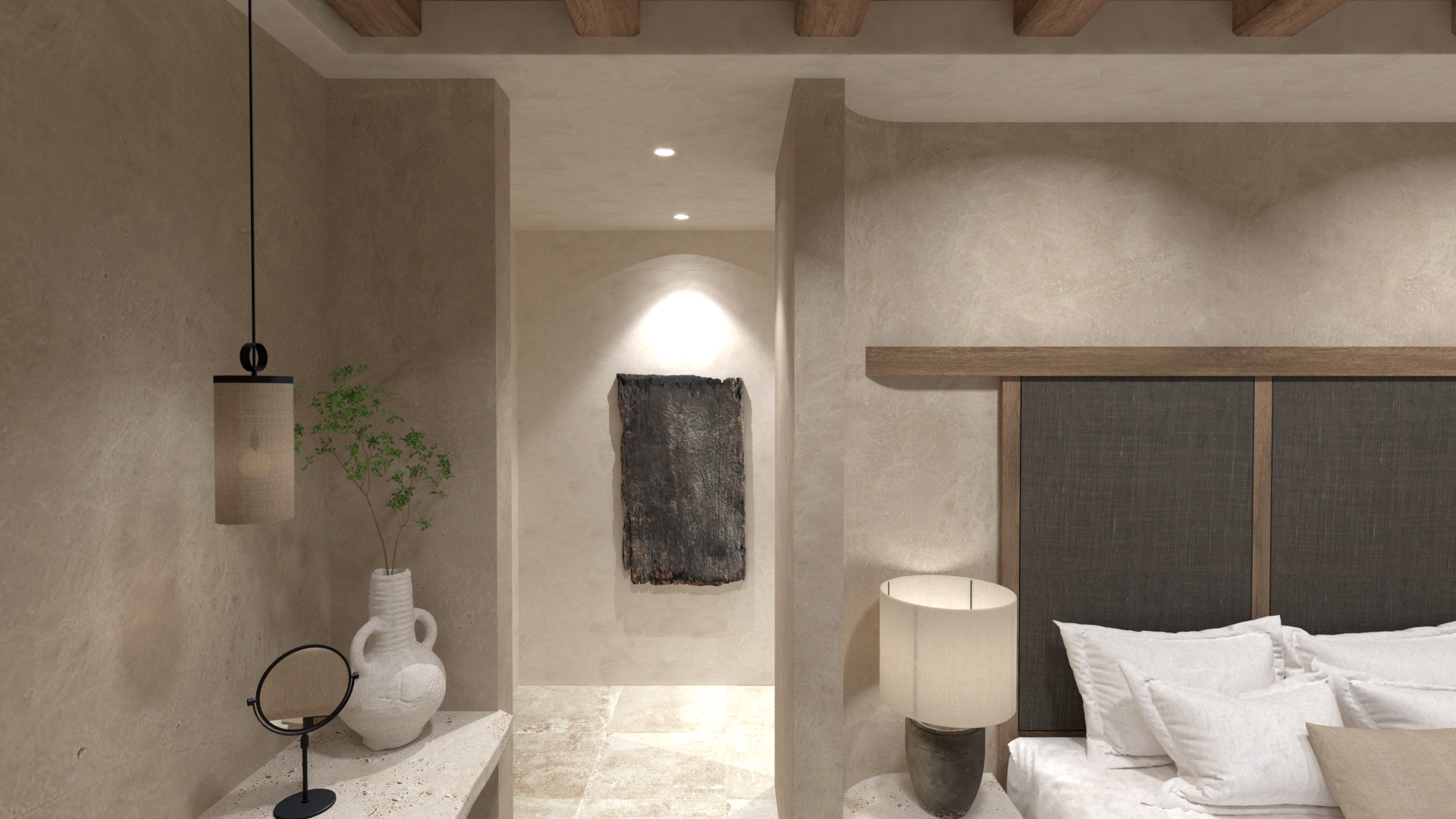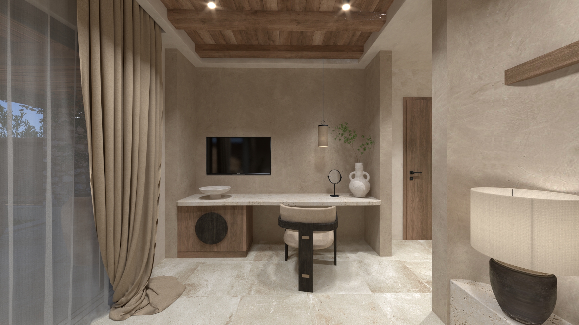 Εσωτερικά, κυριαρχούν ανεπιτήδευτες υφές: ακατέργαστα σοβάδες, ξύλο με φυσικές ρωγμές, πατητή τσιμεντοκονία, χειροποίητα κεραμικά. Το φως είναι απαλό και διάχυτο, με έμφαση στις σκιές των υλικών.